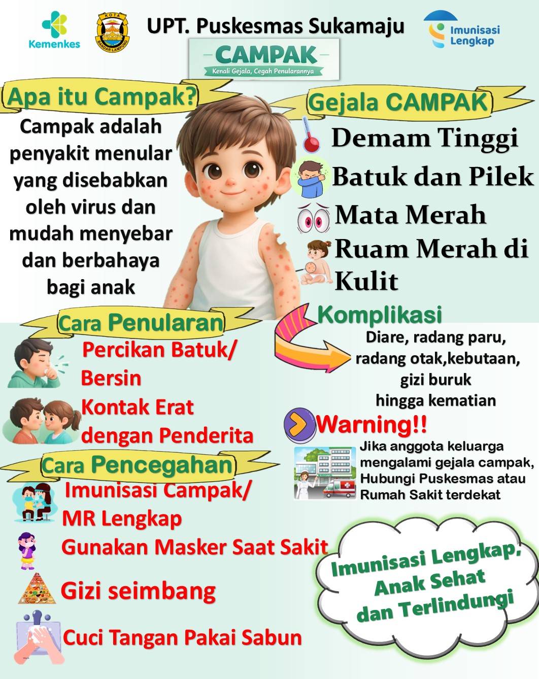 Campak adalah penyakit infeksi saluran pernapasan yang sangat menular. Gejala penyakit campak, yaitu ruam kulit di seluruh tubuh dan gejala seperti flu. Penyakit campak disebabkan oleh virus yang dapat menular dari percikan air liur. Umumnya gejala muncul sekitar satu hingga dua minggu setelah tubuh terpapar virus tersebut.Campak pada bayi dan anak-anak bisa disebabkan oleh virus rubeola. Penyakit ini menyebar melalui kontak langsung dengan orang yang mengidap virus tersebut atau melalui tetesan di udara